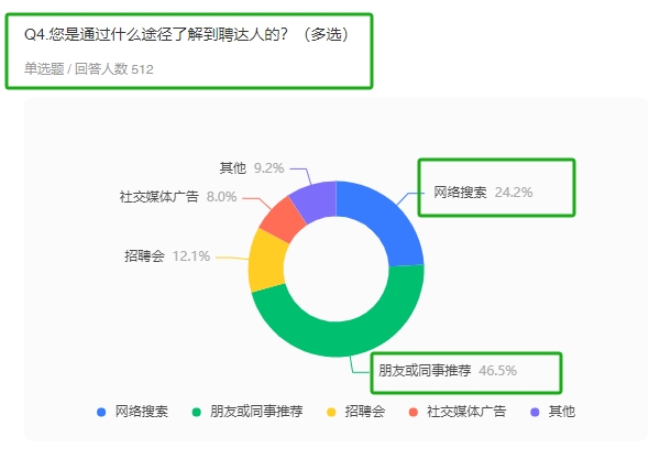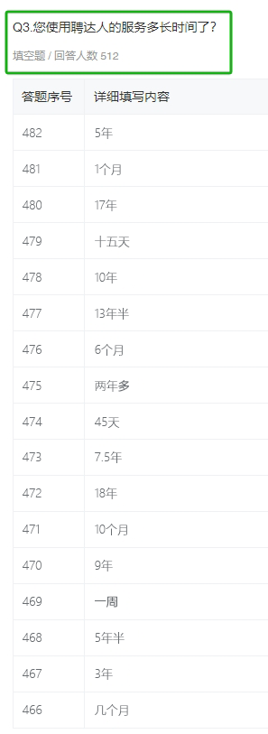 在使用聘達(dá)人的服務(wù)時(shí)長(zhǎng)方面,答卷中既有與聘達(dá)人相識(shí)數(shù)日的新朋友,也有相伴多年的老朋友。大家相依相伴,共同鑄就了聘達(dá)人日益壯大的平臺(tái),也為自己贏得了更多更如意的工作機(jī)會(huì)。