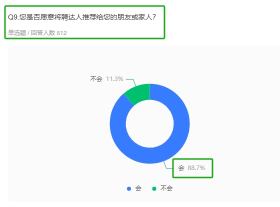 俗話說“一個(gè)好漢三個(gè)幫”,近50%的伙伴(上圖)是通過朋友或同事推薦與聘達(dá)人結(jié)下不解之緣。同時(shí),高達(dá)88.7%的伙伴(下圖)愿意把聘達(dá)人推薦給身邊人。這份信任,讓我們的合作更加長(zhǎng)久。聘達(dá)人也將秉持 “一地簽約,全國(guó)服務(wù)” 的模式,與更多人攜手共進(jìn),實(shí)現(xiàn)互利多贏。